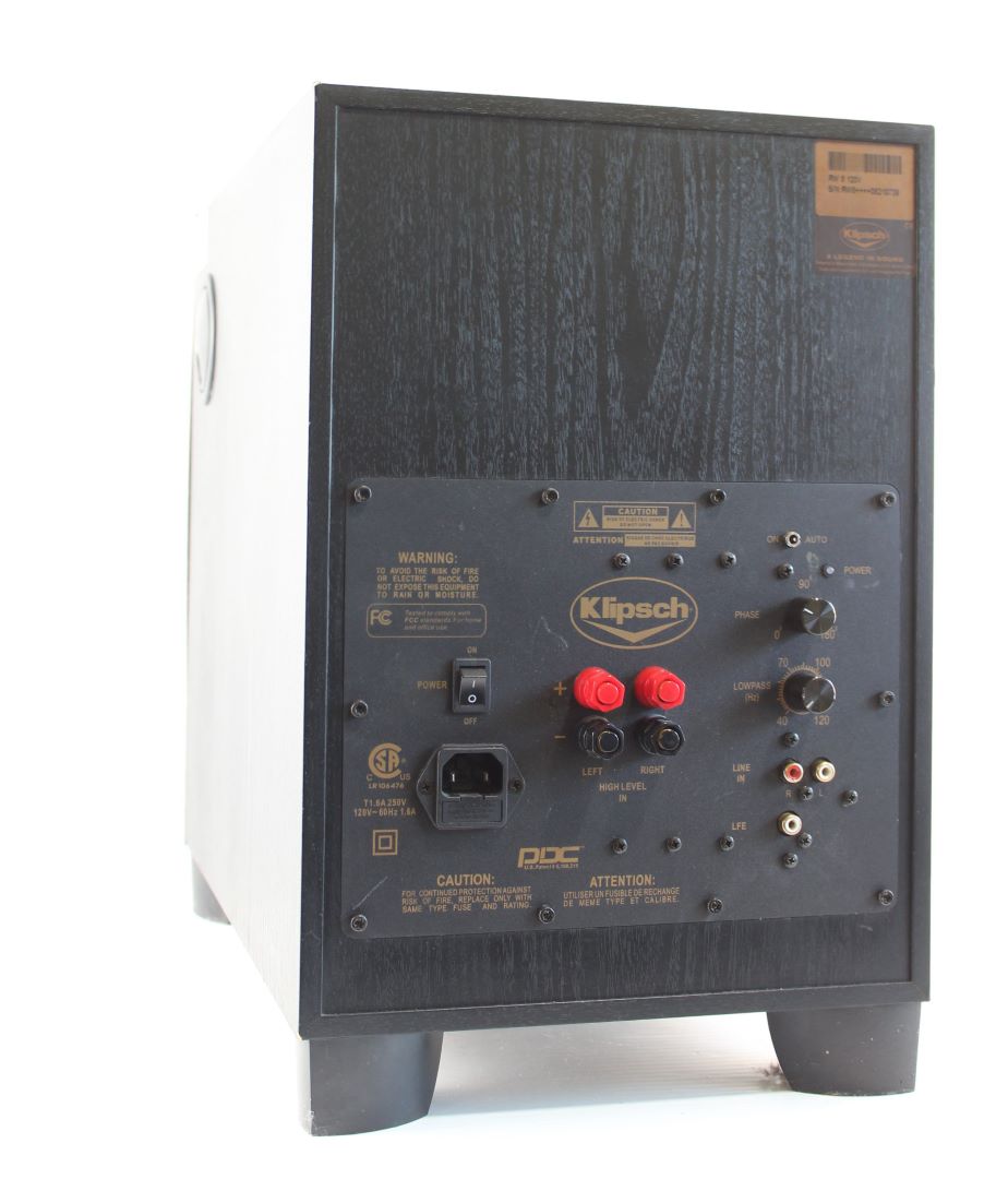Conception alimentée par Bass-reflex, woofer à cône en aluminium de 8 pouces à tir frontal, amplificateur de classe A/B de 190 W, 32 Hz-120 Hz ± 3 dB, 29 lb.