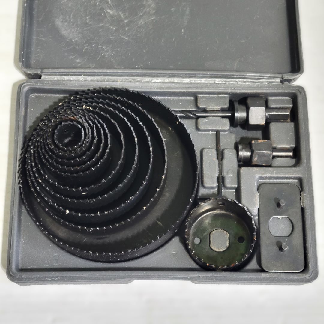 12 lames de scie (3/4, 7/8, 1 1/8, 1 1/4, 1 1/2, 1 3/4, 2, 2 1/2, 3, 3 1/2, 4, 5) ; 2 mandrins ; plaque d’installation ; clé hexagonale ; étui de transport