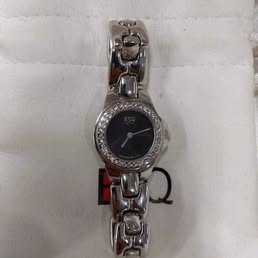 Montre en acier inoxydable argenté avec cadran noir. REMARQUE: la montre mesure environ 6 et 3/8 pouces de long. La montre est fonctionnelle avec une batterie en direct. Boîte d’origine disponible.