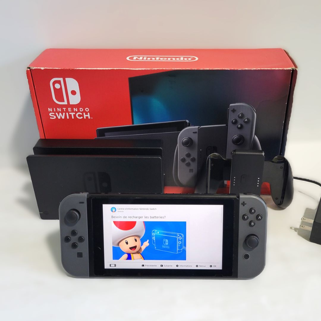 L’ensemble comprend la console et son adaptateur, les joycons, le dock, le comfort grip, un fil HDMI et la boite originale.