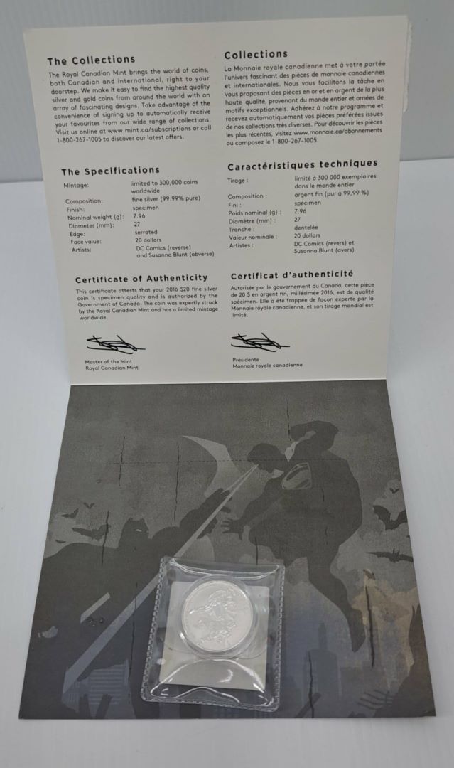 PIÈCE DE MONNAIE DE 20$ EN ARGENT MONNAIE ROYALE CANADIENNE SUPERHÉROS (SUPERMAN ET BATMAN) 2016