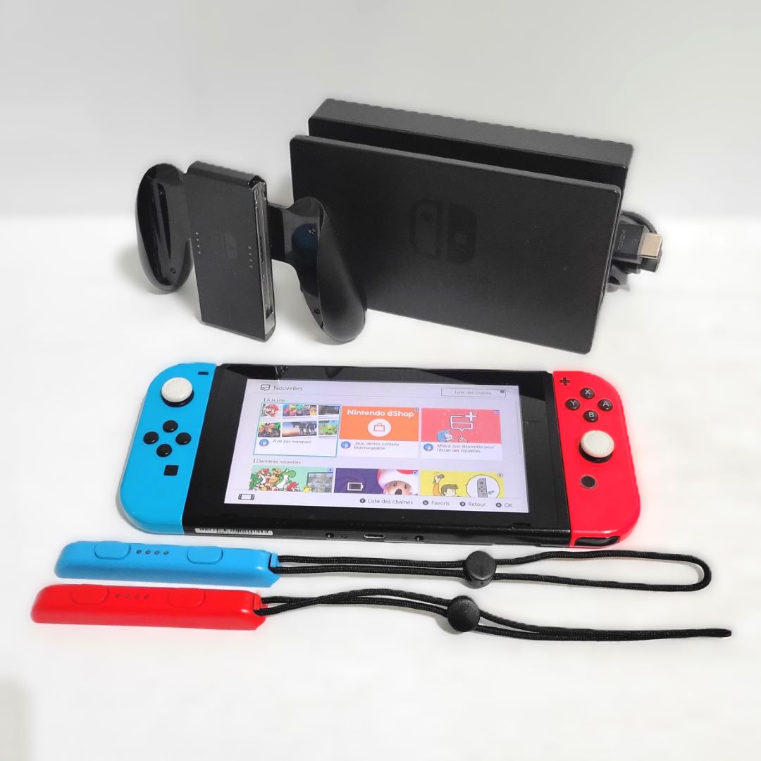 L’ensemble comprend la switch avec son bloc de charge, les joycons, la manette pour joycons, le dock, les dragonnes ainsi qu’un fil HDMI