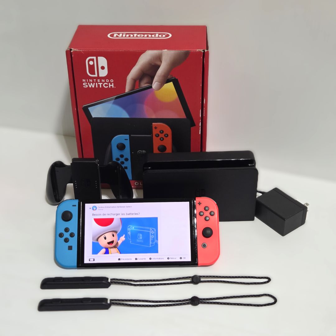 L’ensemble comprend la Switch avec son adaptateur, ses joycons, comfort grip, le dock, les dragonnes et un fil HDMI